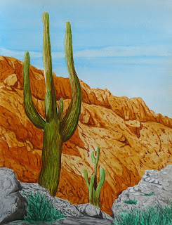Τετάρτη 24/06/2009. Είχαμε κάνει πολλά έργα με κυρίαρχο χρώμα το μπλε (θάλασσα και ουρανό) και χρειαζόμασταν αλλαγή. Θέμα «τοπίο αμερικανικής ερήμου» με την μονοτονία να σπάει από έναν κάκτο που βρίσκεται στο κέντρο του θέματος.